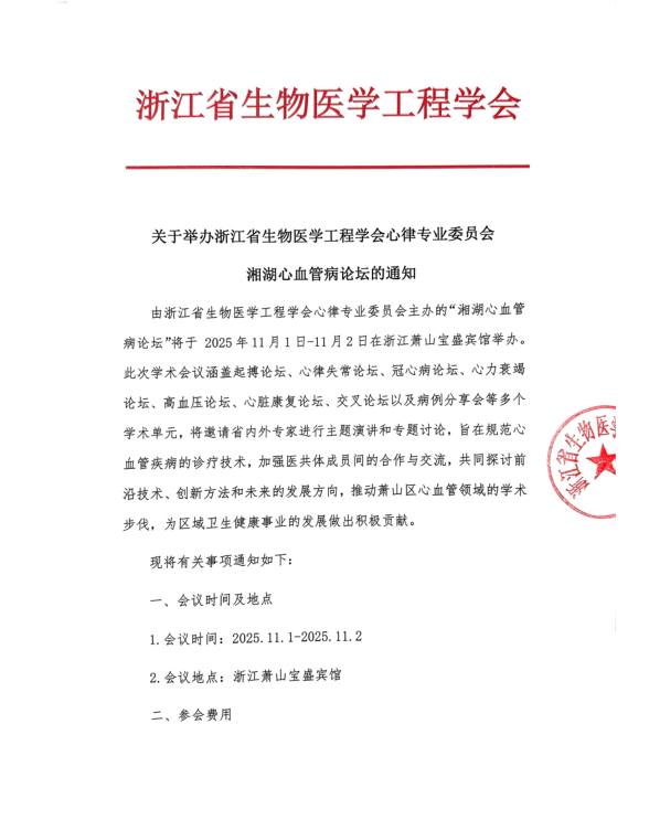 关于举办浙江省生物医学工程学会心律专业委员会湘湖心血管病论坛的通知