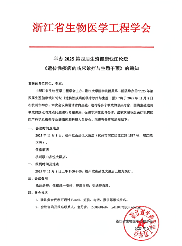 举办2025第四届生殖健康钱江论坛《遗传性疾病的临床诊疗与生殖干预》的通知