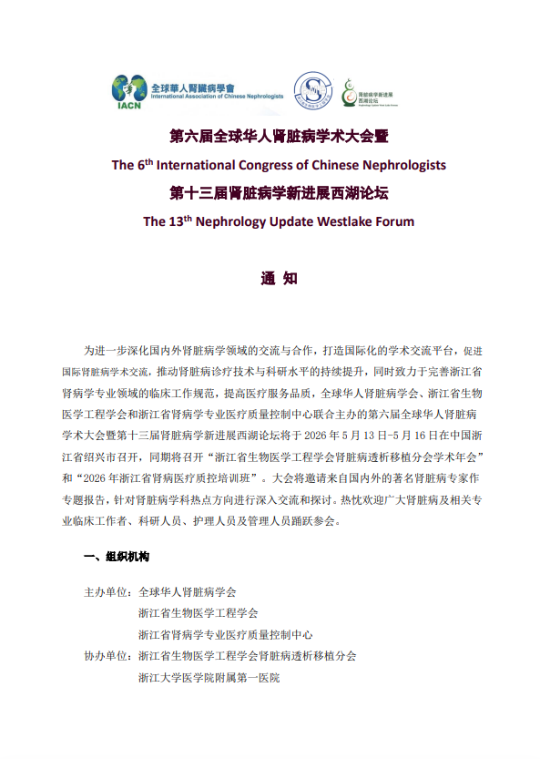第六届全球华人肾脏病学术大会暨第十三届肾脏病学新进展西湖论坛通知